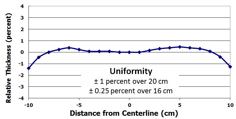 This configuration also provides exceptional uniformity. Isoflux has demonstrated coating thickness uniformity of ±0.25 percent over a 16 cm diameter area with no rotation or masking. No rotation or masking translates to simpler equipment and higher utilization and coating efficiency. The data shown below is for a Ta2O5 coating applied off-axis to a stationary substrate.