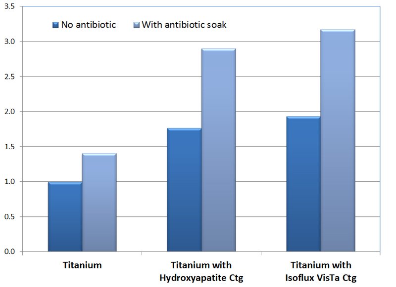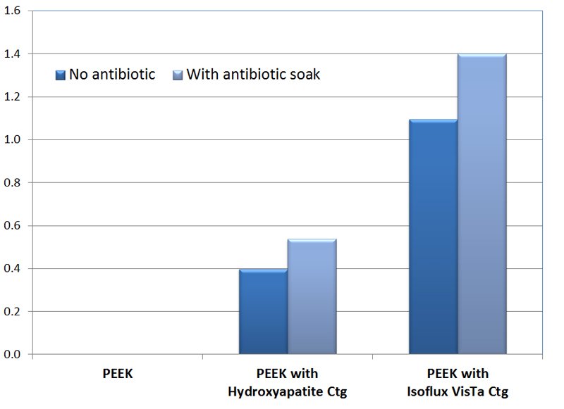 Samples of both PEEK and titanium plugs were prepared in three different treatments - uncoated, coated with hydroxyapatite, and coated with Isoflux VisTa coating. Samples were tested both with and without pre-soaking in antibiotics. The samples were then inoculated with 105 colony forming units of Staph. epidermis and implanted into rat calvial defects. After 4 weeks, the samples were tested for push out strength to determine the level of adhesion to the surrounding bone.