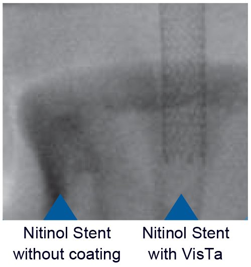 Tantalum provides enhanced visibility of devices like stents, which is a particular problem for self-expanding nitinol stents which are poorly visible under fluoroscopy, as seen in the image to the right. An uncoated nitinol stent is virtually invisible under X-ray whereas a stent coated with VisTa is clearly visible, giving doctors the ability to easily visualize both the position and orientation of the device. This enhanced visibility is achieved without the addition of marker bands, which can improve imaging but which can negatively affect the performance of the device.